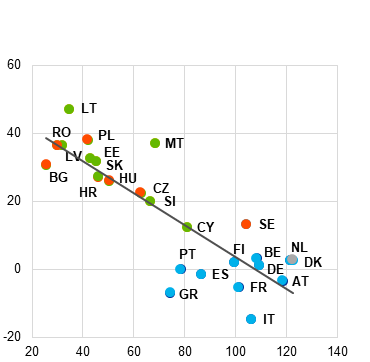 Aprila 2024 je začel veljati reformirani Pakt za stabilnost in rast, s čimer so se spremenila pravila o začetku postopka v zvezi s čezmernim primanjkljajem na podlagi dolga. Cilj reformiranih pravil je zaščititi vzdržnost javnega dolga in proticiklično naravnanost fiskalne politike, sprejeti bolj srednjeročen pristop k proračunskim politikam ter med drugim doseči tudi okrepitev nacionalne odgovornosti v zvezi z okvirom. Pravila tudi upoštevajo, da se lahko reforme, naložbe in fiskalna vzdržnost medsebojno krepijo in jih je zato treba spodbujati. Nazadnje je cilj pravil tudi zagotovitev učinkovitejšega izvrševanja.[12] Medtem ko ostajajo pravila o uvedbi postopka v zvezi s čezmernim primanjkljajem na podlagi primanjkljaja večinoma nespremenjena, so se pravila o uvedbi postopka zaradi dolga spremenila, kot je opisano v okvirju 2. V letu 2024 na podlagi rezultatov za leto 2023 ni bil sprožen noben postopek v zvezi s čezmernim primanjkljajem zaradi dolga, saj bodo nacionalni fiskalno-strukturni načrti – kot del reformiranega javnofinančnega okvira EU – objavljeni šele jeseni 2024, ki bodo zajemali javnofinančne strategije od leta 2025 dalje.