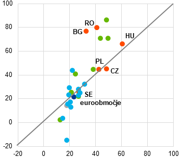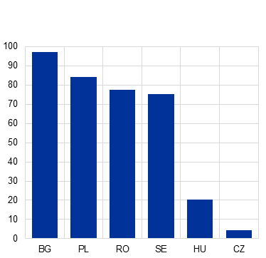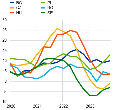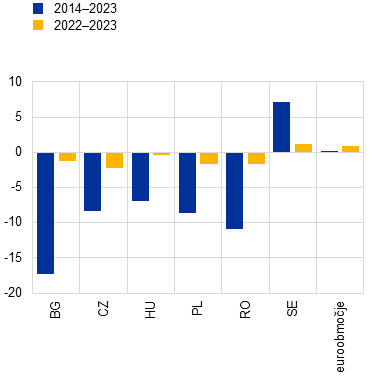 Priznati je treba, da bi bilo mogoče tudi Belgijo in Dansko obravnavati kot osamelca, saj je bila 12-mesečna povprečna stopnja inflacije v teh dveh državah maja 2024 občutno pod povprečjem euroobmočja (za 1,5 oziroma 2,3 odstotne točke). Velika razlika v dinamiki inflacije v primerjavi z euroobmočjem v teh dveh državah je bila predvsem posledica večjega zmanjšanja v komponenti energentov v indeksu HICP, ki je bil rezultat hitrejšega prenosa veleprodajnih cen energentov na maloprodajne cene, kar je bilo predvsem odraz posebnih značilnosti energetskih pogodb.