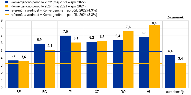 V zvezi s »povprečno stopnjo inflacije, zabeleženo v enem letu pred pregledom«, je bila stopnja inflacije izračunana kot sprememba 12-mesečnega povprečja indeksa HICP v referenčnem obdobju od junija 2023 do maja 2024 v primerjavi s prejšnjim 12-mesečnim povprečjem. Inflacija je bila izmerjena na podlagi indeksa HICP, ki je bil razvit za namene ocenjevanja konvergence stabilnosti cen na primerljivi osnovi (glej razdelek 6.2 v angleški izdaji poročila). V zvezi s pojmom »največ treh držav članic z najboljšimi doseženimi rezultati glede stabilnosti cen«, ki se uporablja za določanje referenčne vrednosti, je bilo uporabljeno netehtano aritmetično povprečje stopenj inflacije v treh državah članicah z najnižjo povprečno stopnjo inflacije (brez upoštevanja osamelcev).