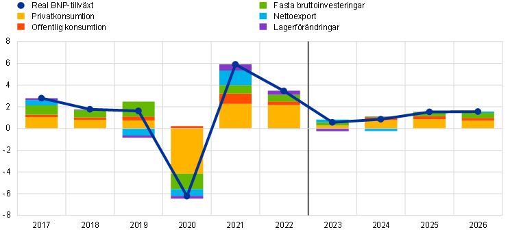 Anm.: Real BNP och komponenter avser säsongs- och kalenderjusterade uppgifter. Historiska data kan skilja sig från Eurostats senaste publiceringar p.g.a. uppgifter som publicerats efter stoppdatumet för prognoserna. Uppgifter kan laddas ned, även på kvartalsbasis, från databasen Macroeconomic Projection Database on the ECB website.
