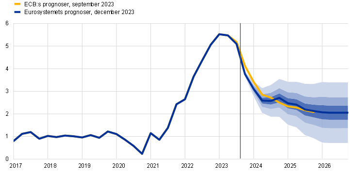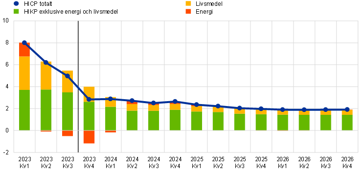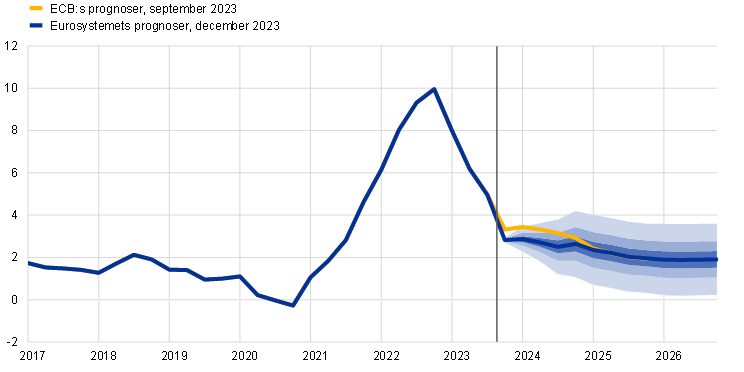 Inflationen har fortsatt att sjunka till följd av fallande energiinflation, effekter av penningpolitiska åtstramningar och av att trycket från tidigare produktionsled har lättat samt flaskhalsar på utbudssidan. Efter att ha sjunkit till 2,4 procent i november 2023 väntas HIKP-inflationen tillfälligt stiga på kort sikt till följd av en ny uppgång i energiinflationen. Den underliggande disinflationsprocessen väntas dock fortsätta, trots kraftiga ökningar av arbetskraftskostnaderna, som i allt högre grad är den viktigaste drivkraften bakom HIKP-inflationen exklusive energi och livsmedel. Trots en viss avkylning väntas arbetsmarknaden förbli stram, vilket tillsammans med kompensationseffekter från tidigare hög inflation torde hålla nominell lönetillväxt hög. Lönetillväxten väntas dock avta under prognosperioden när de uppåtriktade effekterna från inflationskompensationen gradvis avtar. Vinsterna ökade markant under 2022, men kommer att försvagas under prognosperioden och ge en buffert för arbetskraftskostnadernas genomslag. Eftersom inflationsförväntningarna på medellång sikt bedöms förbli förankrade kring ECB:s inflationsmål på 2 procent förväntas den totala HIKP-inflationen minska från 5,4 procent 2023 till ett genomsnitt på 2,7 procent 2024, 2,1 procent 2025 och 1,9 procent 2026. Jämfört med prognoserna från september 2023 har HIKP-inflationen nedreviderats för 2023 och 2024, främst på grund av att de senaste datautfallen varit lägre än väntat och lägre antaganden för energiråvarupriserna, medan den är oförändrad för 2025.