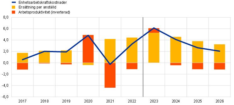 Även om den nominella löneökningen väntas förbli kraftig, med stöd av fortsatt strama arbetsmarknader, väntas den gradvis sjunka med tiden i takt med att trycket kopplade till inflationskompensation och höjningar av minimilönerna avtar. Tillväxten i ersättningen per anställd beräknas minska från 5,3 procent 2023 till 3,3 procent 2026. Jämfört med prognoserna från september har tillväxttakten uppreviderats för 2024 men är oförändrad för 2025. Upprevideringen för 2024 återspeglar en stramare arbetsmarknad och förväntade kraftigare löneökningar under den närmaste tiden. Starkare löneökningar innebär också att köpkraftsförlusterna sedan inflationsökningen väntas återhämta sig i slutet av 2024, vilket är något tidigare än vad som antogs i septemberprognoserna. Ökningen i enhetsarbetskostnader väntas ha nått en topp och beräknas minska betydligt, delvis till följd av den förväntade ökningen i produktivitetstillväxt (diagram 8), som trots detta väntas ligga kvar under den nivå som impliceras av den historiska trenden.