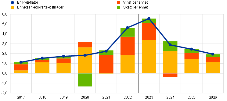 För mer information om dekomponeringen av BNP-deflatorn och den roll som vinsten per enhet spelar för inflationsanalysen, se rutan av E. Hahn, ”How have unit profits contributed to the recent strengthening of euro area domestic price pressures?”, Economic Bulletin, nr 4, ECB, 2023 samt Arce, O., Hahn, E. och Koester, G., “How tit-for-tat inflation can make everyone poorer”, ECB Blog, 30 mars 2023.