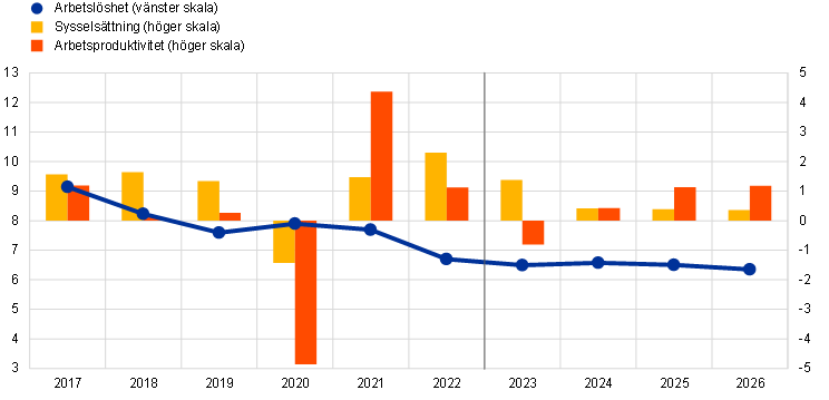 Arbetsmarknaden väntas förbli motståndskraftig, trots en viss avkylning, med en måttligare sysselsättningstillväxt (i förhållande till BNP) än 2023. Tillväxten i den totala sysselsättningen förväntas avta men förbli positiv, en nedgång från 2,3 procent 2022 till 1,4 procent 2023, för att därefter stabiliseras på 0,4 procent under perioden 2024–2026 (diagram 3). Jämfört med prognoserna från september 2023 har sysselsättningstillväxten uppreviderats med 0,6 procentenheter under hela prognosperioden (i kumulativa termer), vilket innebär en nedrevidering av arbetsproduktivitetstillväxten. Detta mönster återspeglar antagandet om hamstring av arbetskraft i det aktuella läget med svag ekonomisk tillväxt, som försvinner under prognosperiodens senare år när ekonomin åter stärks. Sammantaget väntas tillväxten i arbetsproduktivitet stärkas under prognosperioden, men produktivitetsnivåerna kommer att ligga kvar betydligt under den långsiktiga linjära trenden. Arbetslösheten väntas öka något på kort sikt och uppgå till 6,6 procent 2024, för att under resten av prognosperioden minska till i genomsnitt 6,5 procent 2025 och 6,4 procent 2026. Detta står i kontrast till den något stigande bana som förutsågs i prognoserna från september 2023, men den allmänna bedömningen av en stram arbetsmarknad gäller fortfarande.