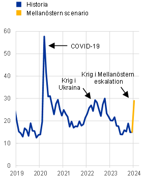 I denna scenarioanalys undersöks svansrisker för grundscenariot från december 2023 till följd av en eventuell ytterligare upptrappning av konflikten i Mellanöstern. Grundscenariot från december 2023 utgår från att den nuvarande konflikten kommer att begränsas geografiskt och därför inte väntas få några större ekonomiska effekter på euroområdets ekonomi utöver dem som redan observerats. Reaktionen på de globala finansmarknaderna efter konfliktens utbrott har varit dämpad, med en inledningsvis måttlig ökning av oljepriserna och ekonomisk osäkerhet, i linje med euroområdets begränsade handelsmässiga och finansiella kopplingar till de drabbade områdena. Scenariot i denna ruta utgår från en omfattande och långvarig upptrappning av konflikten och en partiell stängning av Hormuzsundet, vilket skulle få större återverkningar på den globala ekonomin och euroområdet jämfört med grundscenariot från december 2023. Detta skulle innebära störningar i den ekonomiska aktiviteten, särskilt i länder som är direkt involverade i konflikten, samt högre priser på energiråvaror samt en ökning av den bredare ekonomiska osäkerheten och störningar på finansmarknaderna (diagram A). Ett sådant scenario betraktas som ett scenario med så kallade svansrisker och med tanke på den stora osäkerheten kring konfliktens utveckling bör uppskattningarna tolkas med stor försiktighet.