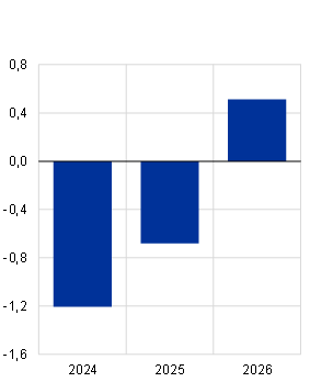 På medellång sikt beräknas BNP-tillväxten stabiliseras på nivåer som i stort sett ligger i linje med genomsnittet före pandemin, med stöd av ökande realinkomster och starkare utländsk efterfrågan. Den reala BNP-tillväxten väntas öka 2024–2025 och stabiliseras 2026 (tabell 2). Även om den senaste tidens medvind avtar väntas tillväxten drivas av lättande inflationstryck som underlättas av att energichocken avklingar samt av en robust inkomsttillväxt. Dessa faktorer bidrar, mot bakgrund av motståndskraftiga arbetsmarknader, till en stark återhämtning av den privata konsumtionen. Tillbakadragandet av energi- och inflationskompensatoriska finanspolitiska stödåtgärder som införts sedan 2022 kommer dock att ha en liten negativ inverkan på tillväxten 2024–2026.