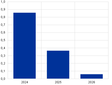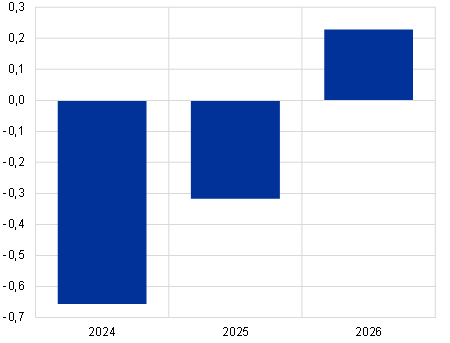 Energiinflationen beräknas tillfälligt öka kraftigt, för att sedan sjunka igen under andra halvåret 2024 för att gå runt noll 2025 och 2026. Ökningen av den årliga energiinflationen på kort sikt återspeglar främst en uppåtriktad baseffekt för december 2023 (diagram 5) och avskaffandet av kompenserande finanspolitiska åtgärder i energiinflationen 2024 (med särskilt stor inverkan på gas- och elpriserna). Ändringar i dessa mått från december 2023 beräknas höja den totala HIKP-inflationen 2024 med cirka 0,4 procentenheter. Uppåtriktad inverkan av baseffekter och upphörandet av statliga åtgärder kommer sannolikt att mer än väl uppväga den senaste tidens sjunkande energipriser (olje-, gas- och elpriser) samt priserna på koldioxidutsläpp. När dessa avtar anses den något nedåtgående trenden i terminspriserna på energiråvaror vara den främsta drivkraften bakom en liten nedgång i HIKP:s energiinflation mot slutet av prognosperioden.