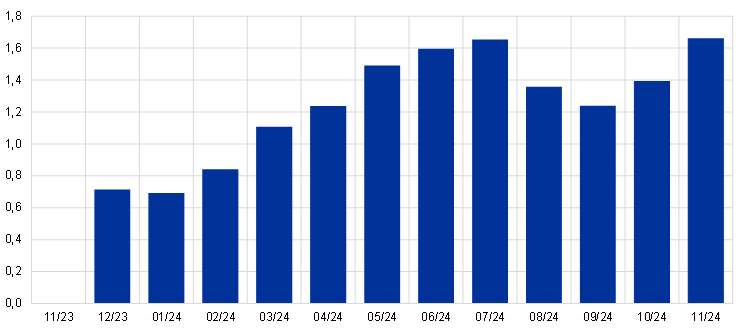 Anm.: Baseffekter avser effekten på förändringar i den årliga inflationstakten till följd av exceptionella prisrörelser för tolv månader sedan i förhållande till en långsiktig genomsnittlig månadstakt. Den kumulativa effekten av baseffekter visas i förhållande till en viss referensmånad. Baseffekterna skulle t.ex. innebära en ökning med 1,6 procentenhet av den totala HIKP-inflationen i juni 2024 jämfört med inflationstakten i november 2023. De kumulativa baseffekter som visas i detta diagram är visserligen positiva, men HIKP-inflationen beräknas sjunka under 2024 (se diagram 4) eftersom nedgången i den årliga inflationstakten i komponenterna livsmedel och HIKPX mer än uppvägde den baseffekterdrivna uppgången i HIKP:s energiinflation.