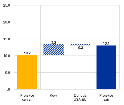 - Celková efektivní celní sazba USA na dovoz zboží od všech obchodních partnerů vzrostla z 16,8 % v červnových projekcích na 21,0 % (viz graf A, panel b). To odráží zdvojnásobení plošných cel na ocel a hliník (z 25 % v projekcích z června 2025 na 50 %) a doplnění 407 derivátů oceli a hliníku na seznam výrobků zasažených celní sazbou, nová plošná cla na měď (50 %), dvoustranné obchodní dohody podepsané s klíčovými obchodními partnery (např. s Evropskou unií, Japonskem, Jižní Koreou a Vietnamem), vyšší vzájemné sazby zavedené 7. srpna v případě zemí, s nimiž nebylo dosaženo žádné obchodní dohody (např. u Indie a Švýcarska), zvýšení cel na brazilský vývoz (na 50 %) a kanadský vývoz (zvýšení cla na zboží, které není v souladu s dohodou mezi Spojenými státy, Mexikem a Kanadou, na 35 %) a sekundární cla na Indii (navýšení o dalších 25 procentních bodů) s cílem penalizovat její nákupy ruské ropy.