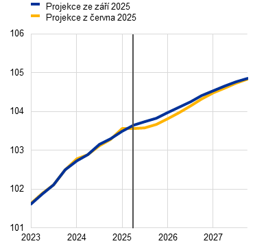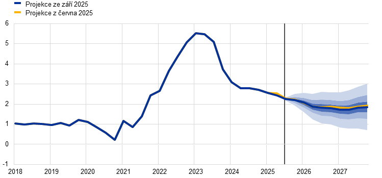 Výhled inflace odpovídá tomu, že se inflace stabilizuje poblíž 2% střednědobého cíle. Celková inflace, měřená harmonizovaným indexem spotřebitelských cen (HICP), by měla po zbytek roku 2025 kolísat poblíž 2 %, v roce 2026 klesnout na 1,7 % a následně se v roce 2027 zotavit na úroveň 1,9 %. Pokles v roce 2026 odráží další postupné snižování cen neenergetických složek, zatímco růst cen energií by měl zůstat volatilní, ale v horizontu projekcí by měl zesílit, částečně v důsledku spuštění systému EU pro obchodování s emisemi ETS2 v roce 2027. Očekává se, že ceny potravin zpočátku i nadále porostou rychleji, neboť se projeví zpožděné dopady dřívějšího růstu cen mezinárodních potravinářských komodit. V letech 2026 a 2027 by však růst měl zmírnit na úroveň mírně nad 2 %. Inflace měřená HICP bez započtení energií a potravin (HICPX) by měla klesat s tím, jak poleví mzdové tlaky a zmírní se růst cen služeb a jak se posilování eura projeví v cenovém řetězci a omezí růst cen zboží. Očekává se, že nižší růst mezd vyplývající z již realizované kompenzace ztrát reálných mezd v minulosti a oživení růstu produktivity povedou k výrazně pomalejšímu růstu jednotkových mzdových nákladů. V porovnání s projekcemi z června 2025 byl výhled celkové inflace měřené HICP revidován pro rok 2025 i 2026 o 0,1 procentního bodu směrem nahoru. Důvodem jsou vyšší aktuální údaje o cenách energetických komodit i předpoklady o jejich budoucím vývoji a také zpožděné účinky vyšších mezinárodních cen potravinářských komodit, které převažují nad posílením eura. Očekává se, že v roce 2027 budou převládat zpožděné účinky posilování eura, což povede k revizi o 0,1 procentního bodu směrem dolů.