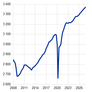 Výhled zahraniční poptávky pro eurozónu zůstává utlumený a v porovnání s červnovými projekcemi byl mírně revidován směrem dolů. Růst zahraniční poptávky v eurozóně by měl klesnout z 3,6 % v roce 2024 na 2,8 % v roce 2025, dále oslabit na 1,4 % v roce 2026 a poté se v roce 2027 zvýšit na 3,1 % (tabulka 2). Ve srovnání s projekcemi z června 2025 byla zahraniční poptávka v eurozóně pro rok 2026 upravena směrem dolů. Kumulativní revize zahraniční poptávky v eurozóně v letech 2025–2027 jsou však menší než revize světového obchodu, což odráží dopady geografických faktorů – konkrétně vyšší než očekávaný dovoz do Spojeného království ve druhém čtvrtletí a revize směrem nahoru pro země střední a východní Evropy, které jsou způsobeny německým fiskálním stimulem a výdaji týkajícími se obrany.