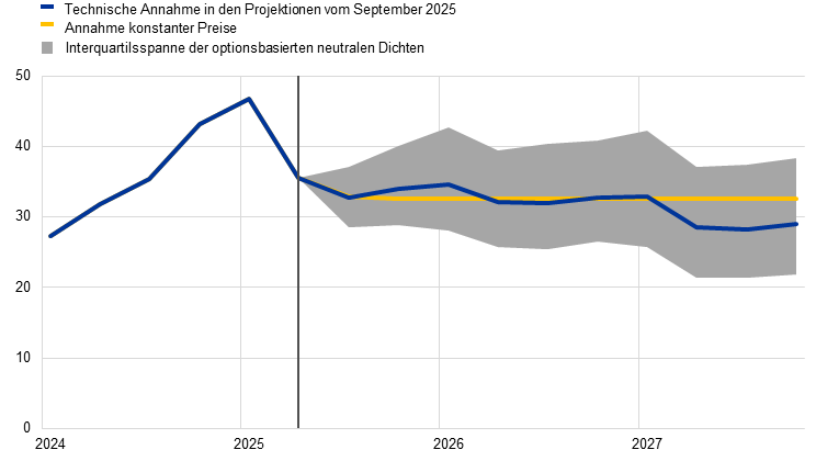 Gegenüber den Projektionen vom Juni 2025 sind die wichtigsten Änderungen der technischen Annahmen höhere Ölpreise, niedrigere Gas- und Rohstoffpreise und ein stärkerer Euro-Wechselkurs. Die Zinsannahmen bleiben indes weitgehend unverändert. Die Ölpreisannahmen wurden für 2025 bis 2027 um durchschnittlich rund 3 % nach oben und die Strompreisannahmen um rund 2 % nach oben revidiert, während die Annahmen für die Großhandelspreise für Gas etwas nach unten revidiert wurden. Auch für im EU-Emissionshandelssystem 1 gehandelte Zertifikate (EU-EHS1-Zertifikate) wird ein etwas niedrigerer Preis angenommen, während der Preis für das EU-Emissionshandelssystem 2 (EU-EHS2) unverändert gelassen wurde. Die Preise für Rohstoffe ohne Energie wurden leicht nach unten revidiert. Der Euro hat seit den Projektionen vom Juni zum US-Dollar um 3,3 % und in nominaler effektiver Rechnung um 2,3 % aufgewertet. Die Annahmen für die Zinssätze sind weitgehend unverändert.