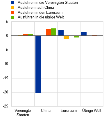 Anmerkung: Die Abbildung zeigt die (ungewichteten) Veränderungen des bilateralen Handels im vierten Quartal 2027. Der Wechselkurs der chinesischen Währung wird teilweise kontrolliert. Die übrige Welt wird berechnet als der einfache Durchschnitt der Exportabweichungen vom Basisszenario für alle Regionen im ECB-Global-Modell mit Ausnahme der USA, Chinas und des Euroraums.