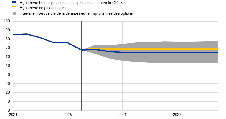 Par rapport aux projections de juin 2025, les principales modifications apportées aux hypothèses techniques sont une hausse des prix du pétrole, une baisse des prix du gaz et des matières premières et une appréciation du taux de change de l’euro, mais les hypothèses financières sont globalement inchangées. Les hypothèses relatives aux prix du pétrole ont été révisées à la hausse d’environ 3 % en moyenne pour 2025-2027 et celles relatives aux prix de l’électricité d’environ 2 %, tandis que pour les prix de gros du gaz, elles ont été légèrement révisées à la baisse. Le prix des quotas au titre du système d’échange de quotas d’émission de l’UE 1 (SEQE-1) est également supposé être légèrement plus bas, tandis que pour le système d’échange de quotas d’émission de l’UE 2 (SEQE-2), le prix est resté inchangé. Les prix des matières premières hors énergie ont été légèrement révisés à la baisse. L’euro s’est apprécié de 3,3 % par rapport au dollar et de 2,3 % en termes effectifs nominaux depuis les projections de juin. Les hypothèses relatives aux taux d’intérêt sont globalement inchangées.