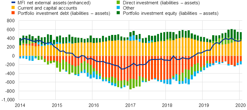 The monetary presentation of the balance of payments (see Chart 3) shows that the net external assets (enhanced) of euro area MFIs increased by €333 billion in the 12-month period to January 2020. This increase was mainly driven by a current and capital accounts surplus and, to a lesser extent, by euro area non-MFIs’ net inflows in portfolio investment equity. This increase was partly offset by euro area non-MFIs’ net outflows in portfolio investment debt securities.