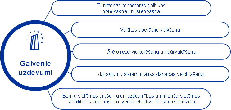ECB ir daļa no Eurosistēmas, kas līdztekus ECB ietver to Eiropas Savienības (ES) dalībvalstu nacionālās centrālās bankas (NCB), kuras ieviesušas euro.[3] Eurosistēmas galvenais mērķis ir saglabāt cenu stabilitāti. ECB veic savus uzdevumus saskaņā ar Līgumu par Eiropas Savienības darbību[4] un Eiropas Centrālo banku sistēmas un Eiropas Centrālās bankas Statūtiem (ECBS Statūtiem)[5] (1. shēma). ECB darbību veic, lai īstenotu savas pilnvaras, nevis ar mērķi gūt peļņu.