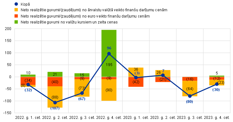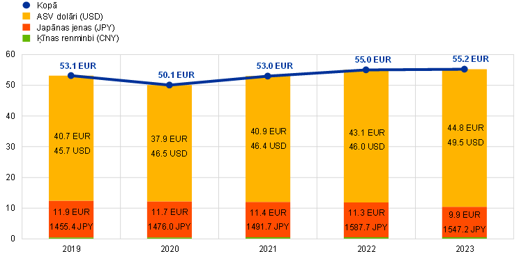 ECB ārvalstu valūtu turējumi[11] ASV dolāros, Japānas jenās un Ķīnas renminbi euro izteiksmē pieauga par 0.2 mljrd. euro (līdz 55.2 mljrd. euro; 5. att.). Tas skaidrojams galvenokārt ar gada laikā gūtajiem ienākumiem, pamatā no ASV dolāru portfeļa. Turklāt, Horvātijai 2023. gada 1. janvārī ieviešot vienoto valūtu, Hrvatska narodna banka nodeva ECB ASV dolāros denominētus ārējo rezervju aktīvus 544 milj. euro vērtībā. Ārvalstu valūtu turējumu kopējās vērtības pieaugumu daļēji kompensēja galvenokārt ASV dolāra un Japānas jenas kursa kritums attiecībā pret euro.