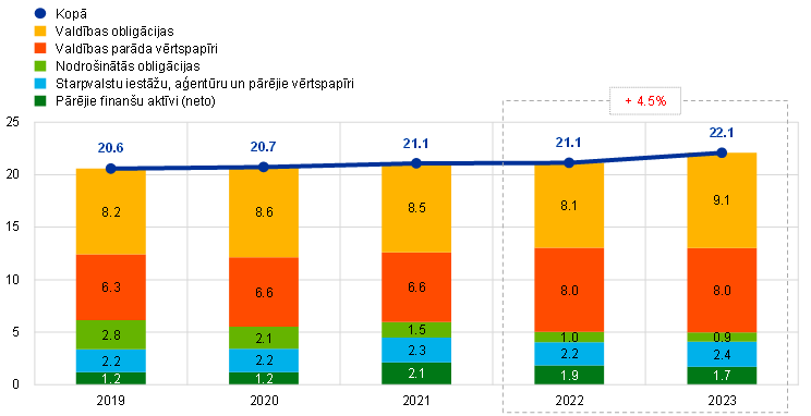 Periodā no 2019. līdz 2022. gadam ECB bilance būtiski palielinājās. To galvenokārt noteica vērtspapīru tiešās iegādes, ko ECB veica, īstenojot Eurosistēmas monetāro politiku (1. att.). Konkrētāk, būtisko palielinājumu 2020. un 2021. gadā galvenokārt noteica vērtspapīru neto iegādes aktīvu iegādes programmas (AIP)[6] ietvaros un pandēmijas ārkārtas aktīvu iegādes programmas (PĀAIP)[7] uzsākšana 2020. gada martā. Vērtspapīru neto iegādes PĀAIP un AIP ietvaros tika pārtrauktas attiecīgi 2022. gada marta beigās un 2022. gada 1. jūlijā, tāpēc ECB bilances apjoma pieaugums 2022. gadā bija mērenāks.