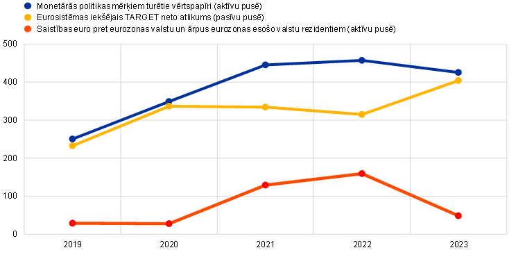 ECB Eurosistēmas iekšējās saistības, kas galvenokārt ietver eurozonas valstu NCB neto TARGET atlikumus attiecībā pret ECB un ECB saistības attiecībā pret ārējo rezervju aktīviem, kurus eurozonas valstu NCB nodeva ECB, tām pievienojoties Eurosistēmai, 2023. gadā palielinājās par 89.6 mljrd. euro (līdz 445.0 mljrd. euro).