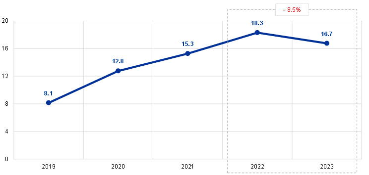 2023. gadā ECB bilance samazinājās par 24.4 mljrd. euro (līdz 674.5 mljrd. euro), un to galvenokārt noteica AIP turējumu pakāpenisks sarukums sakarā ar šā portfeļa vērtspapīru, kuriem pienācis dzēšanas termiņš, pamatsummas maksājumu tikai daļēju atkārtotu ieguldīšanu no 2023. gada marta līdz jūnijam, kā arī šādas atkārtotas ieguldīšanas pilnīgu pārtraukšanu kopš 2023. gada jūlija.