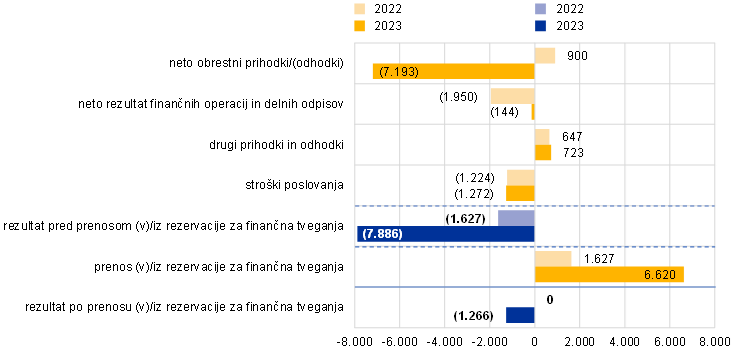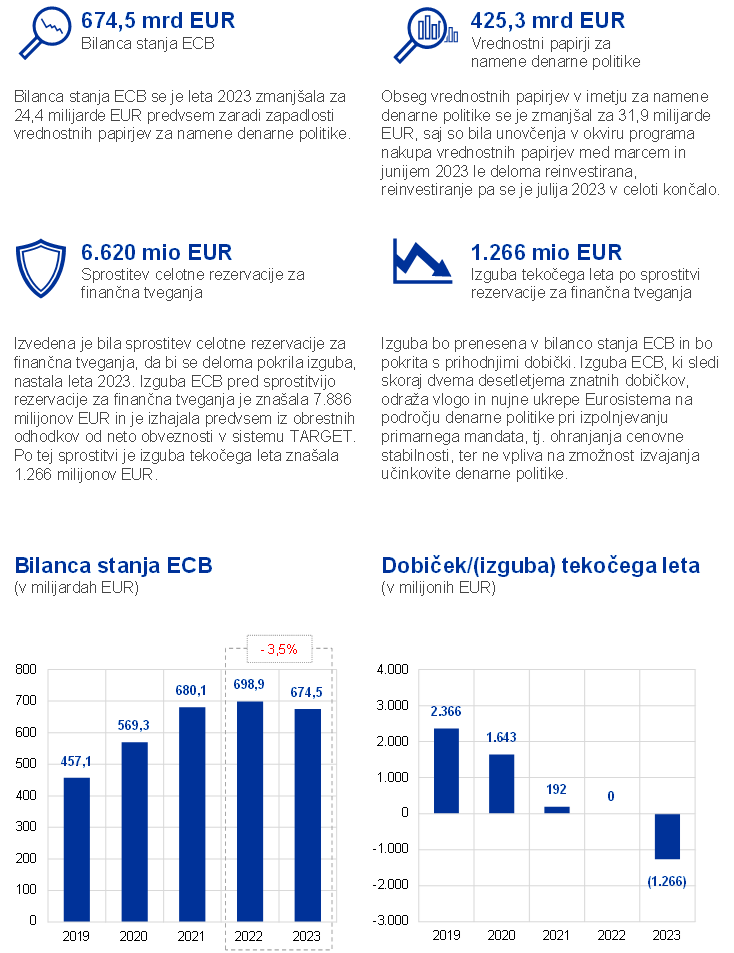 Izguba ECB v letu 2023 je po sprostitvi celotne rezervacije za finančna tveganja znašala 1.266 milijonov EUR (2022: nič). Po sklepu Sveta ECB bo izguba prenesena v bilanco stanja ECB in bo pokrita s prihodnjimi dobički.