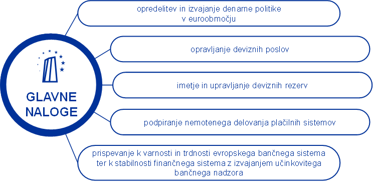 ECB je del Eurosistema, ki poleg ECB obsega še nacionalne centralne banke držav članic Evropske unije, katerih valuta je euro.[3] Poglavitni cilj Eurosistema je ohranjati stabilnost cen. ECB svoje naloge opravlja tako, kot je opisano v Pogodbi o delovanju Evropske unije[4] ter v Statutu Evropskega sistema centralnih bank in Evropske centralne banke (Statut ESCB)[5] (slika 1). ECB svoje dejavnosti izvaja z namenom izpolnjevanja svojega mandata in ne z namenom ustvarjanja dobička.