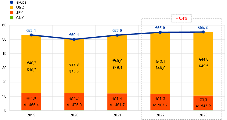 Devizna imetja ECB[11] v ameriških dolarjih, japonskih jenih in kitajskih renminbijih, izražena v eurih, so se povečala za 0,2 milijarde EUR na 55,2 milijarde EUR (graf 5), in sicer predvsem zaradi prihodkov med letom, ki so v glavnem izhajali iz dolarskega portfelja. Poleg tega je Hrvatska narodna banka ob sprejetju enotne valute na Hrvaškem 1. januarja 2023 v ECB prenesla devizne rezerve v ameriških dolarjih v vrednosti 544 milijonov EUR. Povečanje skupne vrednosti deviznih imetij je deloma izravnala predvsem depreciacija ameriškega dolarja in japonskega jena v razmerju do eura.