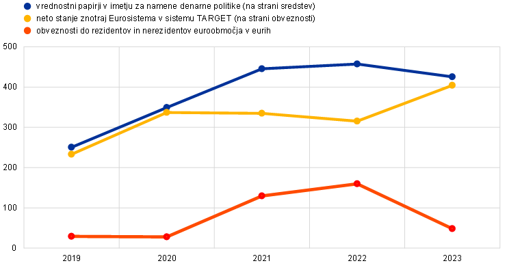 Na gibanje obveznosti znotraj Eurosistema vpliva predvsem gibanje neto obveznosti v sistemu TARGET. K spremembam neto obveznosti v sistemu TARGET v obdobju 2019–2023 so prispevali predvsem nakupi in unovčenja vrednostnih papirjev za namene denarne politike, ki se poravnajo prek računov v sistemu TARGET, ter spremembe v obveznostih do rezidentov in nerezidentov euroobmočja v eurih (graf 10). Leta 2023 so bili denarni prilivi iz unovčenja vrednostnih papirjev za namene denarne politike manjši od denarnih odlivov, povezanih z zmanjšanjem obveznosti do rezidentov in nerezidentov euroobmočja v eurih, kar je povzročilo splošno povečanje neto obveznosti v sistemu TARGET.
