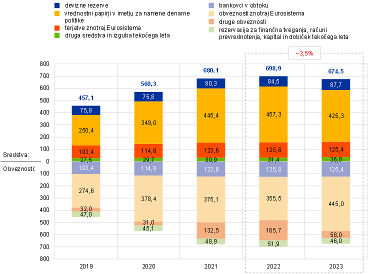 Leta 2023 se je bilanca stanja ECB zmanjšala za 24,4 milijarde EUR na 674,5 milijarde EUR zahvaljujoč predvsem postopnemu zmanjševanju imetij v okviru programa nakupa vrednostnih papirjev zaradi le delnega ponovnega investiranja glavnice zapadlih vrednostnih papirjev v tem portfelju med marcem in junijem 2023 ter zaradi popolnega prenehanja ponovnega investiranja z julijem 2023.