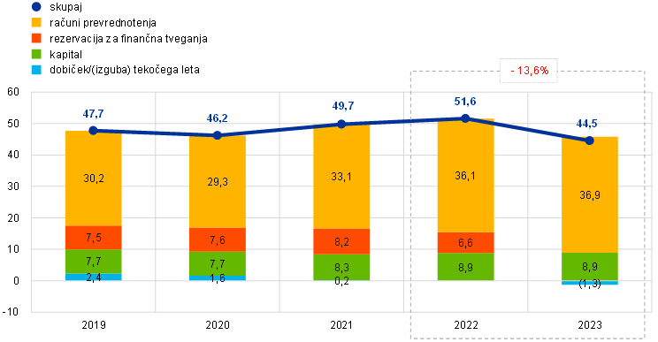 Ob koncu leta 2023 je neto kapital ECB znašal 44,5 milijarde EUR (graf 11), kar je 7,0 milijarde EUR manj kot ob koncu letu 2022 zaradi izgub, nastalih v letu 2023. Rezervacija za finančna tveganja je bila v celoti porabljena za pokritje dela te izgube, s čimer se je izguba tekočega leta zmanjšala na 1,3 milijarde EUR. Zmanjšanje neto kapitala ECB, ki izhaja iz izgube leta 2023, sta deloma odtehtala (i) povečanje na računih prevrednotenja, predvsem zaradi zvišanja tržne cene zlata, izražene v eurih, v letu 2023 ter (ii) prispevek Hrvatske narodne banke k vplačanemu kapitalu, računom prevrednotenja in rezervaciji za finančna tveganja, potem ko je Hrvaška 1. januarja 2023 uvedla enotno valuto.