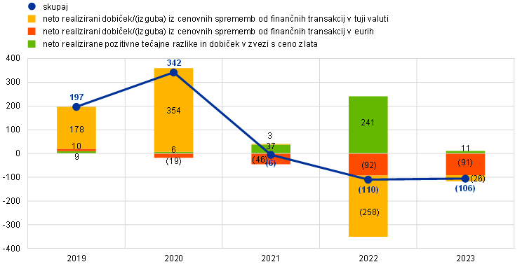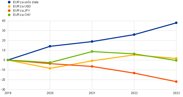 Eurska protivrednost zlata in terjatev v zlatu v imetju ECB se je leta 2023 povečala za 2,7 milijarde EUR na 30,4 milijarde EUR (graf 4), in sicer predvsem zaradi zvišanja tržne cene zlata, izražene v eurih. To povečanje je privedlo tudi do enakovrednega zvišanja vrednosti računov prevrednotenja zlata (glej razdelek 1.3.2 »Neto kapital«). Poleg tega je Hrvatska narodna banka ob sprejetju enotne valute na Hrvaškem 1. januarja 2023 v ECB prenesla zlato v vrednosti 96 milijonov EUR.