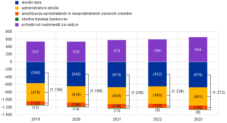 Letni izdatki, ki jih ima ECB v zvezi z nadzorniškimi nalogami, se povrnejo prek letnih nadomestil za nadzor, ki se zaračunajo nadzorovanim subjektom. Nadomestila za nadzor so vključena v izkaz poslovnega izida pod postavko »Neto prihodki/odhodki iz provizij«. ECB ima tudi pravico, da nadzorovanim subjektom, ki ne izpolnjujejo veljavne bančne zakonodaje EU na področju zahtev glede skrbnega in varnega poslovanja (vključno z nadzorniškimi odločitvami ECB), naloži upravne kazni. S tem povezani prihodki se evidentirajo v izkazu poslovnega izida pod postavko »Neto prihodki/odhodki iz provizij«. |