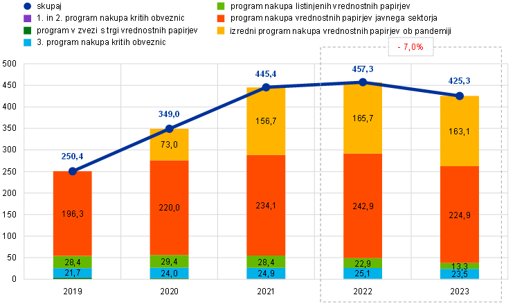 Na podlagi relevantnih sklepov Sveta ECB je Eurosistem glavnico zapadlih vrednostnih papirjev, kupljenih v okviru programa PEPP, še naprej v celoti ponovno investiral skozi vse leto, v okviru programa nakupa vrednostnih papirjev (APP) pa do konca februarja 2023. Eurosistem je v okviru programa APP od začetka marca do konca junija 2023 le delno ponovno investiral glavnico zapadlih vrednostnih papirjev, julija 2023 pa je prenehal s ponovnim investiranjem. Zaradi teh sklepov se je portfelj vrednostnih papirjev, ki jih ima ECB za namene denarne politike, zmanjšal za 31,9 milijarde EUR na 425,3 milijarde EUR (graf 2), pri čemer so se zaradi unovčenj imetja v okviru programa PSPP zmanjšala za 18,0 milijarde EUR, v okviru programa ABSPP za 9,5 milijarde EUR in v okviru programa CBPP3 za 1,6 milijarde EUR. Portfelj v okviru programa PEPP se je zmanjšal za 2,6 milijarde EUR predvsem zaradi neto učinka amortizacije premij in diskontov[8] od vrednostnih papirjev v tem portfelju.
