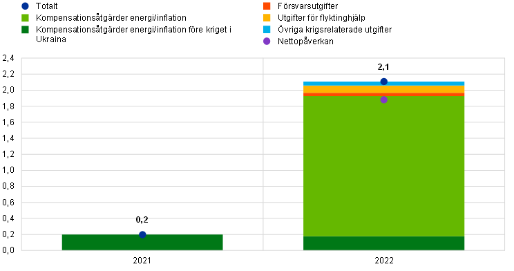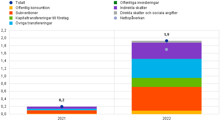 Anm.: Positiva siffror avser finanspolitiskt stöd. Staplarna och summorna avser finanspolitiskt stöd brutto. Nettoeffekten visar stödet brutto minus de diskretionära finansieringsåtgärderna för de angivna ändamålen, enligt Eurosystemet.