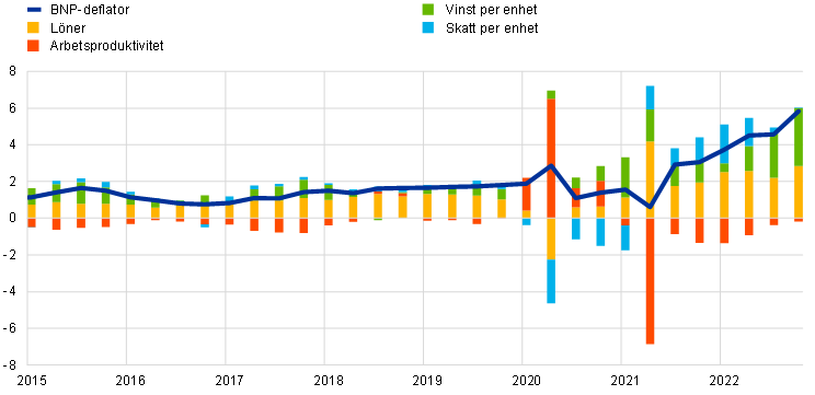 För ECB:s penningpolitik var 2022 en vändpunkt. Inflationsutsikterna förändrades abrupt i och med att två olika störningar samtidigt drabbade ekonomin. För det första drabbades euroområdet av en aldrig tidigare skådad serie negativa utbudschocker till följd av pandemirelaterade störningar i leveranskedjorna, Rysslands orättfärdiga invasion av Ukraina och den därpå följande energikrisen. Detta ledde till kraftigt ökade insatskostnader för alla sektorer i ekonomin. För det andra uppstod en positiv efterfrågechock när ekonomin åter öppnades efter pandemin. Detta gjorde att företagen kunde låta de stigande kostnaderna slå igenom på priserna betydligt snabbare och starkare än tidigare.