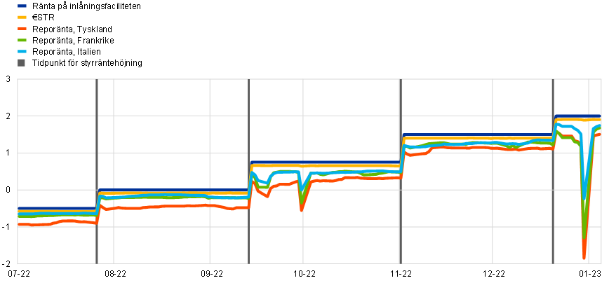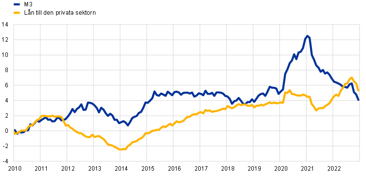 Efter årets sista penningpolitiska sammanträde meddelade vi därför i december att räntorna alltjämt skulle behöva stiga avsevärt i en stadig takt för att nå nivåer som var tillräckligt restriktiva för att säkerställa att inflationen skulle återgå till vårt mål inom rimlig tid. Samtidigt konstaterade vi att ECB:s styrräntor visserligen är vårt främsta verktyg för att ange den penningpolitiska inriktningen, men att vi från och med mars 2023 skulle börja minska APP:s värdepappersportfölj i en måttlig och förutsägbar takt. Därefter beslutades i oktober att omkalibrera villkoren för den tredje serien riktade långfristiga refinansieringstransaktioner och därigenom undanröja en avskräckande faktor för frivillig förtida återbetalning av utestående medel. De penningpolitiska tillgångarna i vår balansräkning minskade med omkring 830 miljarder euro mellan slutet av juni (när nettotillgångsköpen upphörde) och slutet av december, vilket bidrog till att vår balansräkning normaliserades.
