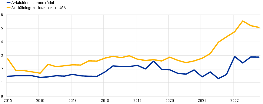 Se rutan ”Comparing labour market developments in the euro area and the United States and their impact on wages” i artikeln ”Wage developments and their determinants since the start of the pandemic”, Economic Bulletin, nr 8, ECB, 2022.