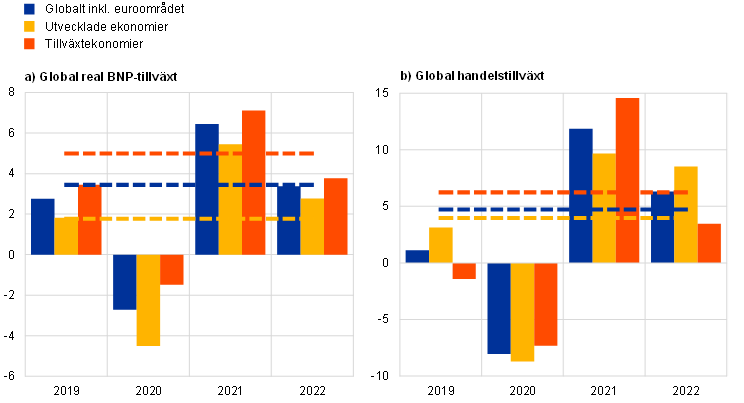 Anm.: Panel a: Aggregaten beräknas med BNP justerad med vikter för köpkraftsparitet. De heldragna linjerna visar data. De streckade linjerna visar långsiktiga genomsnitt (mellan 1999 och 2022). De senaste observationerna avser 2022, uppdaterade den 18 april 2023. Panel b: Global handelstillväxt definieras som tillväxt i global import, inklusive euroområdet. De heldragna linjerna visar data. De streckade linjerna visar långsiktiga genomsnitt (mellan 1999 och 2022). De senaste observationerna avser 2022, uppdaterade den 18 april 2023.