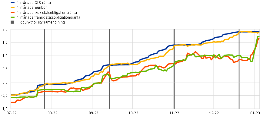 I mars påskyndade vi minskningen av nettoköpen inom APP och i april meddelade vi att vi förväntade oss att avsluta dem under det tredje kvartalet. I juli höjde vi styrräntorna för första gången på elva år och fortsatte att höja dem med flera stora steg vid de penningpolitiska sammanträden som följde. Takten i denna anpassning var en viktig signal till allmänheten om att vi var fast beslutna att få ner inflationen. Detta bidrog till att förankra inflationsförväntningarna även när inflationen tog fart.