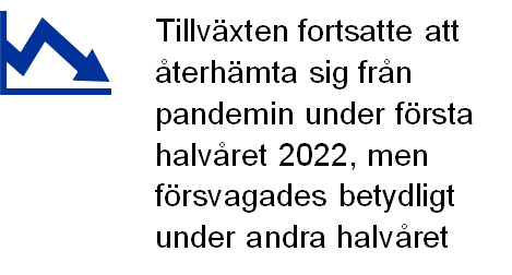 Den globala ekonomiska tillväxten sjönk till 3,4 procent 2022 från 6,4 procent 2021, eftersom Rysslands krig i Ukraina och andra geopolitiska faktorer skapade osäkerhet samtidigt som inflationen steg och de finansiella förhållandena blev stramare. Inbromsningen var brett baserad i såväl utvecklade ekonomier som tillväxtekonomier (diagram 1.1, panel a). Den skedde efter en stark återhämtning 2021, framför allt till följd av lättnaderna i pandemirelaterade restriktioner och en efterföljande uppgång i den globala efterfrågan. I början av 2022 utlöste kriget i Ukraina ytterligare en stor chock för världsekonomin. Detta ledde till en kraftig uppgång och mycket hög volatilitet i råvarupriserna och en försämrad livsmedelstrygghet, särskilt för tillväxtekonomier. Stigande energi- och livsmedelspriser förstärkte inflationstrycket globalt, sänkte hushållens reala disponibla inkomster och fick centralbanker att snabbt strama åt penningpolitiken. I ett klimat av stigande räntor, sjunkande börsvärden och förhöjd riskaversion blev de globala finansiella förhållandena betydligt stramare.