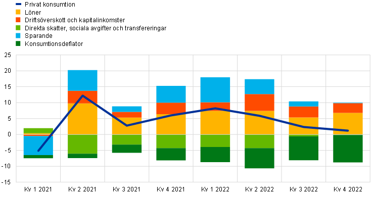 Tillväxten i privatkonsumtion var motståndskraftig under 2022 då arbetsinkomsterna var fortsatt stabila och besparingar understödde uppdämd efterfrågan (diagram 1.4). Den positiva utvecklingen drevs främst av tjänstekonsumtionen, som steg kraftigt när de pandemirelaterade restriktionerna hävdes. Tillväxten i privatkonsumtion avtog dock under året till följd av de låga utgifterna för konsumtionsvaror samtidigt som den reala disponibla inkomsten sjönk och det fanns en kvardröjande osäkerhet. Totalt sett ökade hushållens utgifter med 4,3 procent under 2022. Stark tillväxt i sysselsättning och gradvis ökande löner innebar att arbetsinkomster, som i högre grad brukar användas för konsumtion än andra inkomstkällor, blev den främsta bidragande faktorn till stigande disponibla inkomster under 2022. Mot slutet av året dämpades emellertid den reala disponibla inkomsten alltmer av stigande inflation, som tog ut de gynnsamma effekterna av den motståndskraftiga arbetsmarknaden och det finanspolitiska stödet.