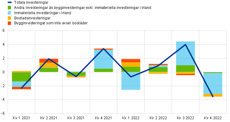 Tillväxten i andra investeringar än bygginvesteringar – en proxyvariabel för privata investeringar som inte avser bostäder – varierade kraftigt under 2022 (diagram 1.5).[1] Exklusive den särskilt volatila komponenten för irländska investeringar i immateriella tillgångar[2] mattades tillväxten i andra investeringar än bygginvesteringar av under året. Den inledde året kraftfullt, då den drevs på av hög efterfrågan, stabila vinster hos företagen och fördelaktiga finansieringsförhållanden, när pandemirelaterade restriktioner hävdes. Rysslands krig i Ukraina och den därpå följande energikrisen tillsammans med neddragningen i penningpolitisk stimulans medförde dock stigande energi- och finansieringskostnader för företagen. Tillsammans med den sjunkande inhemska och globala efterfrågan i ett klimat av hög osäkerhet minskade detta deras incitament för att göra investeringar. I fråga om nivåer låg andra investeringar än bygginvesteringar i slutet av 2022 långt under nivån från fjärde kvartalet 2019, som hade stärkts av en betydande ökning i investeringar i immateriella tillgångar. Exklusive irländska immateriella tillgångar hade de redan återhämtat sig i slutet av 2020. Totalt sett ökade andra investeringar än bygginvesteringar med 5,2 procent 2022.