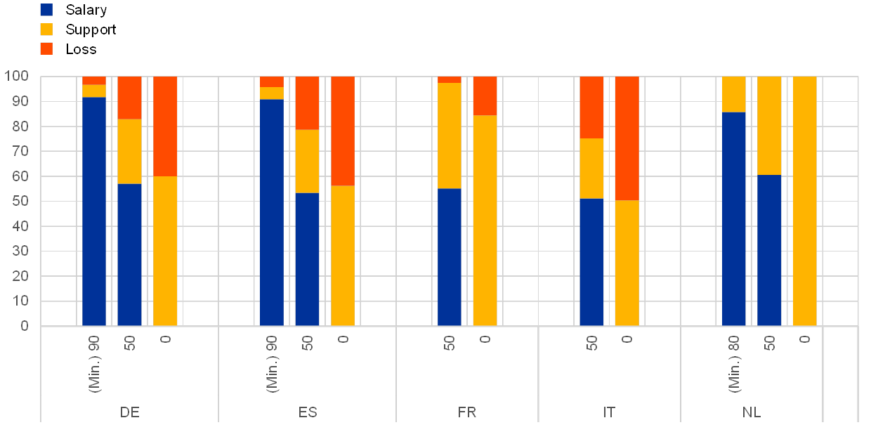 This box estimates take-up rates and calculates wage replacement rates for the schemes in the five largest countries in the euro area. These economies account for more than 80% of the euro area-wide compensation of employees. Combining wage replacement rates with the number of participants makes it possible to calculate the impact of short-time work on household disposable income during the pandemic. Understanding the effects of current and planned short-time work and temporary lay-off schemes is important for developing macroeconomic projections. Therefore the impact of the schemes needs to be monitored as and when more information becomes available regarding actual take-ups.