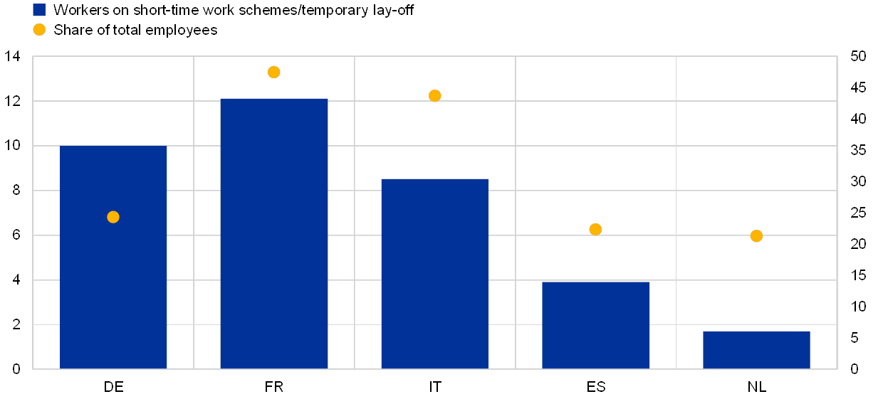 In all five of the largest euro area countries it is likely that a substantial share of employees is on short-time work or temporary lay-off. Preliminary estimates (Chart B) based on different sources suggest there may be about 10 million employees covered by these schemes in Germany (24% of employees) and about 12 million in France (47% of employees). The equivalent numbers are estimated to be 8.5 million in Italy (44% of employees), 3.9 million in Spain (23% of employees) and 1.7 million in the Netherlands (21% of employees). As official data for some of these countries have yet to be released these figures should be viewed with caution. Here they are used for illustrative purposes to gauge the income effects of the measures. Moreover, the figures are likely to be an upper bound, reflecting take-up rates during the time lockdown measures were in place. Additional government measures designed to support the self-employed are not analysed in this box.