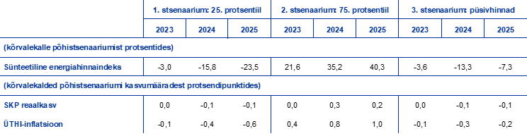 Arvestades energiahindade edasise arenguga seotud suurt ebakindlust, tuletatakse energiahindade alternatiivsed arengusuunad optsioonidest tuletatud nafta- ja gaasihindadest ning püsivhindade arengu alusel, et hinnata ÜTHI-inflatsiooni ja SKP reaalkasvu väljavaadetele avalduvat mõju. Käesolevas tundlikkusanalüüsis kasutatakse sünteetilist energiahinnaindeksit, milles on ühendatud nii nafta- kui ka gaasifutuuride hinnad. Alternatiivsed langus- ja tõususuunad on tuletatud 25. ja 75. protsentiiliga jaotusest, mis on saadud nafta- ja gaasihinna optsioonidest tuletatud neutraalsetest tihedustest seisuga 23. mai 2023 (selle kuupäeva seisuga on koostatud 2023. aasta märtsi ettevaate tehnilised eeldused). Mõlemad jaotused osutavad sellele, et 2023. aasta juuni ettevaate tehniliste eeldustega on seotud tõusuriskid, mis on eriti märgatavad gaasifutuuride hindade puhul. Ühtlasi lähtutakse nii nafta- kui ka gaasihindade puhul püsivhindade eeldusest. Alternatiivsete suundumuste mõju hinnatakse ettevaadetes kasutatavate EKP ja eurosüsteemi makromajanduslike mudelite abil. Järgmises tabelis on esitatud nende mudelite alusel prognoositud keskmine mõju SKP reaalkasvule ja inflatsioonile.