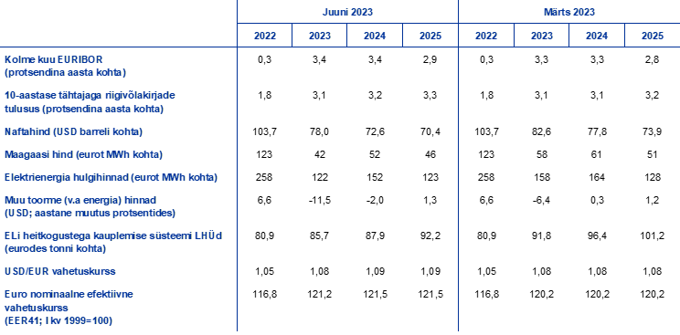 Eurosüsteemi ekspertide 2023. aasta märtsi ettevaatega võrreldes hõlmavad tehnilised eeldused veidi kõrgemaid intressimäärasid, madalamat naftahinda, oluliselt madalamaid gaasi ja elektri hulgihindu ning euro kallinemist. Tehnilised eeldused intressimäärade ja toormehindade kohta põhinevad turgude ootustel seisuga 23. mai 2023. Lühiajalisi intressimäärasid mõõdetakse kolme kuu EURIBORina ja turgude ootused tuletatakse futuurilepingute intressimääradest. Pikaajaliste intressimäärade prognoosimisel lähtutakse riikide kümneaastase tähtajaga võlakirjade tulususest.[4] Alates 2023. aasta märtsi ettevaate koostamise lõppkuupäevast on nii lühi- kui ka pikaajalised intressimäärad mõnevõrra tõusnud. Selle suundumuse taustal on nende prognoose ligikaudu 10 baaspunkti võrra ülespoole korrigeeritud, pidades silmas EKP baasintressimäärade edasist tõusu.