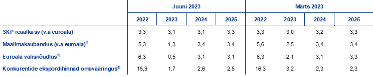 1. Tehnilised eeldused, näiteks naftahindade ja vahetuskursside kohta, põhinevad andmetel seisuga 23. mai 2023. Üleilmse majanduskasvu ettevaate koostamine jõudis lõpule 23. mail ja euroala käsitlev makromajanduslik ettevaade valmis seisuga 31. mai 2023. Ehkki see oli päev enne seda, kui avaldati 2023. aasta maid käsitlev Eurostati kiirhinnang euroala ÜTHI kohta, kaasati ettevaatesse ka varasemad riikide kiirhinnangud, mis hõlmavad üle 80% euroalast. Ettevaade hõlmab aastaid 2023–2025. Nii pikka ajavahemikku käsitleva ettevaatega kaasneb väga suur ebakindlus, mida tuleb ettevaate tõlgendamisel silmas pidada. Vt artikkel „The performance of the Eurosystem/ECB staff macroeconomic projections since the financial crisis”, EKP majandusülevaade 8/2019. Vt tabelites ja joonistel sisalduvaid andmeid eraldi failis: http://www.ecb.europa.eu/pub/projections/html/index.en.html. EKP ja eurosüsteemi ekspertide varasemad makromajanduslikud ettevaated on tervikuna kättesaadavad andmebaasis aadressil https://sdw.ecb.europa.eu/browseSelection.do?node=5275746.